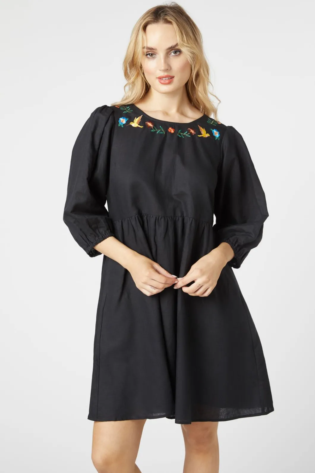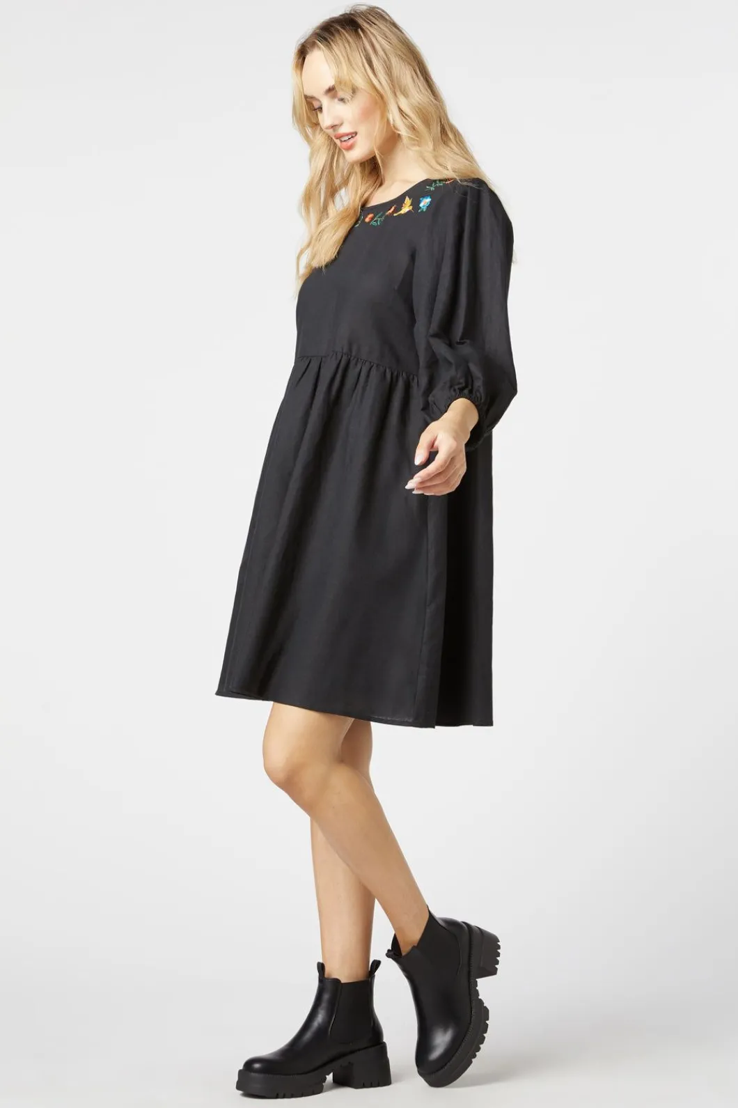– A Relaxed Dress Featuring Whimsical Neckline Embroidery