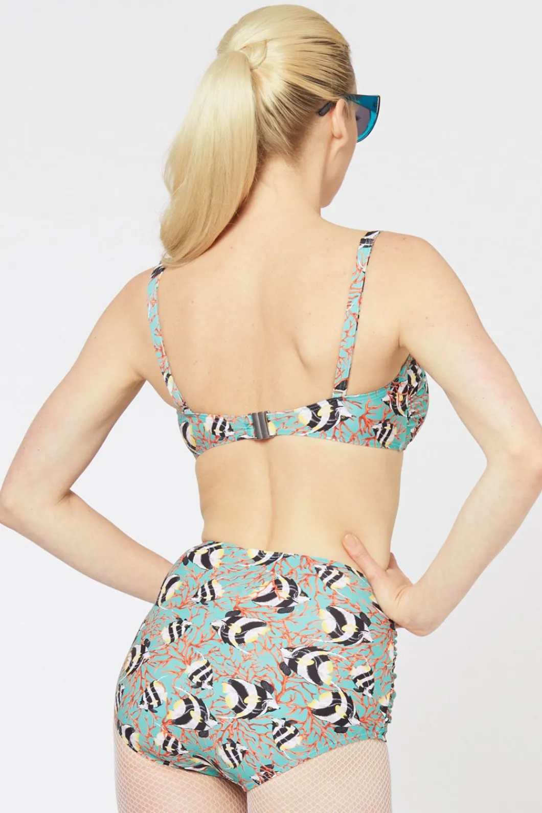 Shine Bright Like A Jewel In This Glorious Bikini! Made From A Nylon Elastane Blend, The Jewel Of The Sea Bikini Sports A Simple Bikini Top With Adjustable Straps, Padding, Metal Clip Closure At Back And Tie Detail At Centre Front. The Bikini Bottoms Are A Retro High Wasted Cut With Ruching At The Front. Both The Top And Bottom Have A Stunning All Over Angel Fish Print. Available In Sea Blue, The Jewel Of The Sea Bikini Is Perfect To Wear With Sandals And A Pair Of Killer Sunnies This Summer.For Health Reasons, We Do Not Accept Returns On The Purchase Of Bathers